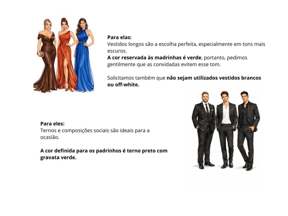 Pensando na harmonia das fotografias e na atmosfera do evento, deixamos abaixo algumas sugestões de vestimenta.